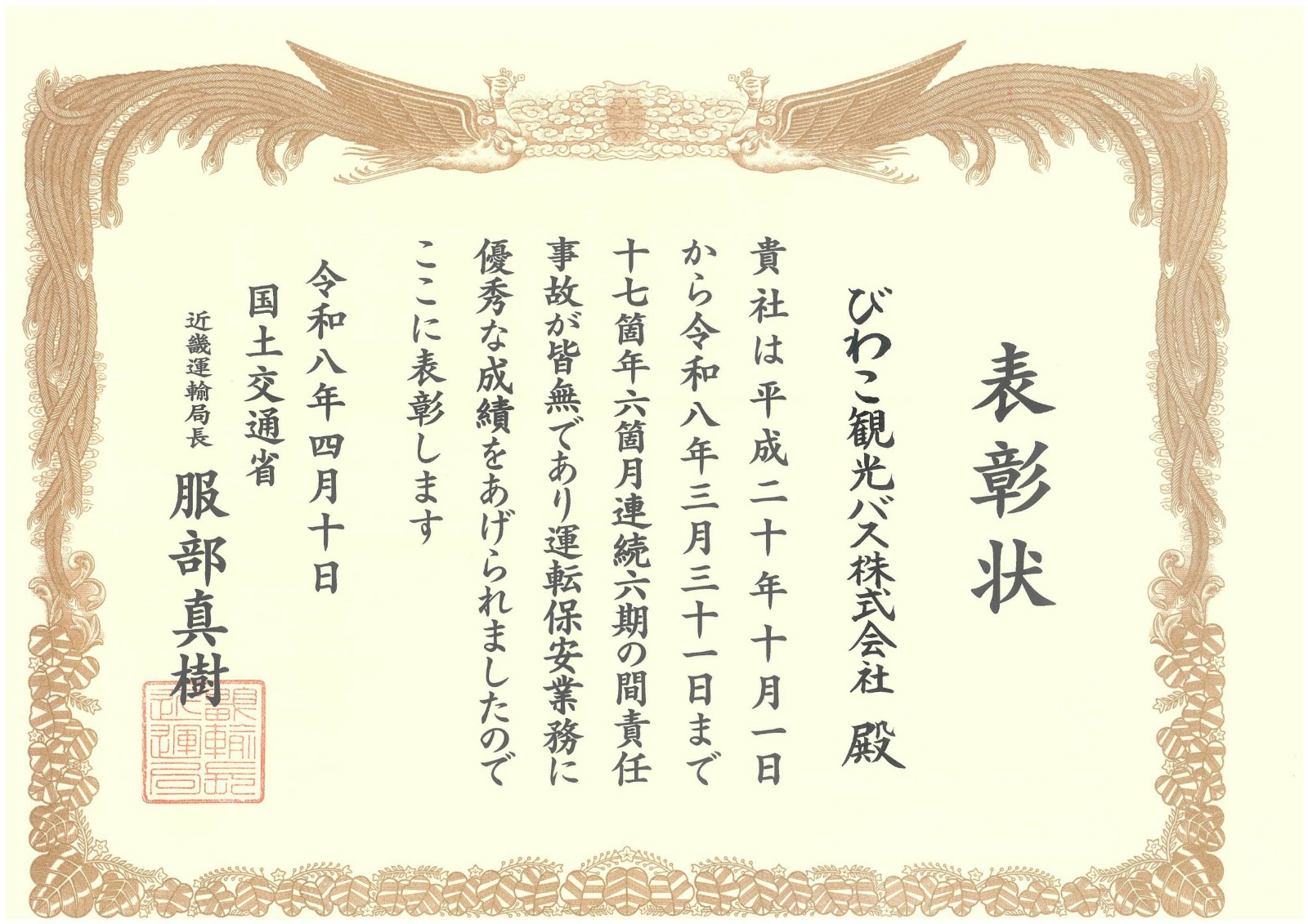 この度、弊社は連続無事故期間が優秀な成績なため、国土交通省近畿運輸局より表彰をいただきました。引き続き貸切バス事業者の使命である安全運行に努め、より一層、お客様に安全で快適な旅をご提供するよう努めてまいります。近畿運輸局HP(令和8年春 バス無事故近畿運輸局長表彰式) https://wwwtb.mlit.go.jp/kinki/press/00001_03659.html